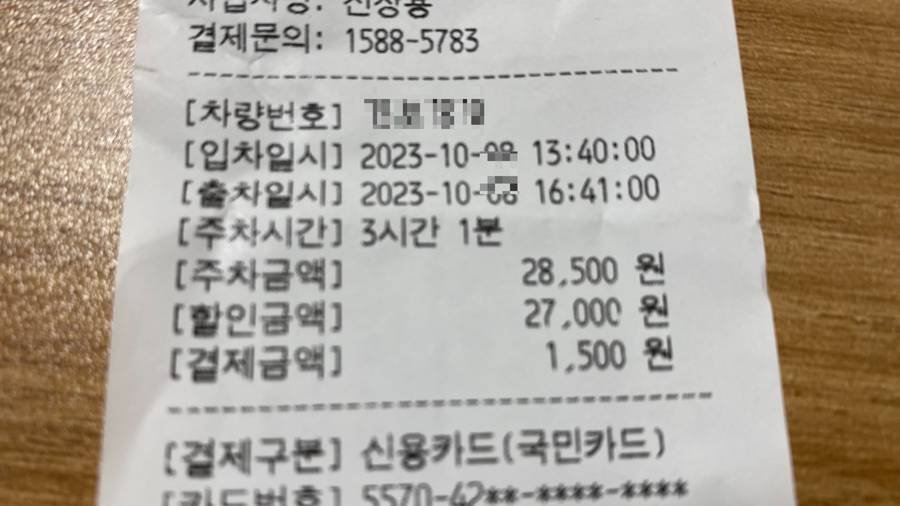 스페이스본 주차비는 10분당 1,500원입니다. 저는 3 시간하고 아쉽게도 1분을 넘겨버렸습니다. 3시간 주차요금은 아래 영수증에서 보시는 바와 같이 27,000원입니다. 결코 저렴하지 않습니다. 그런데 제가 이곳에 주차를 한 이유가 있습니다. 바로 주차할인 때문입니다.