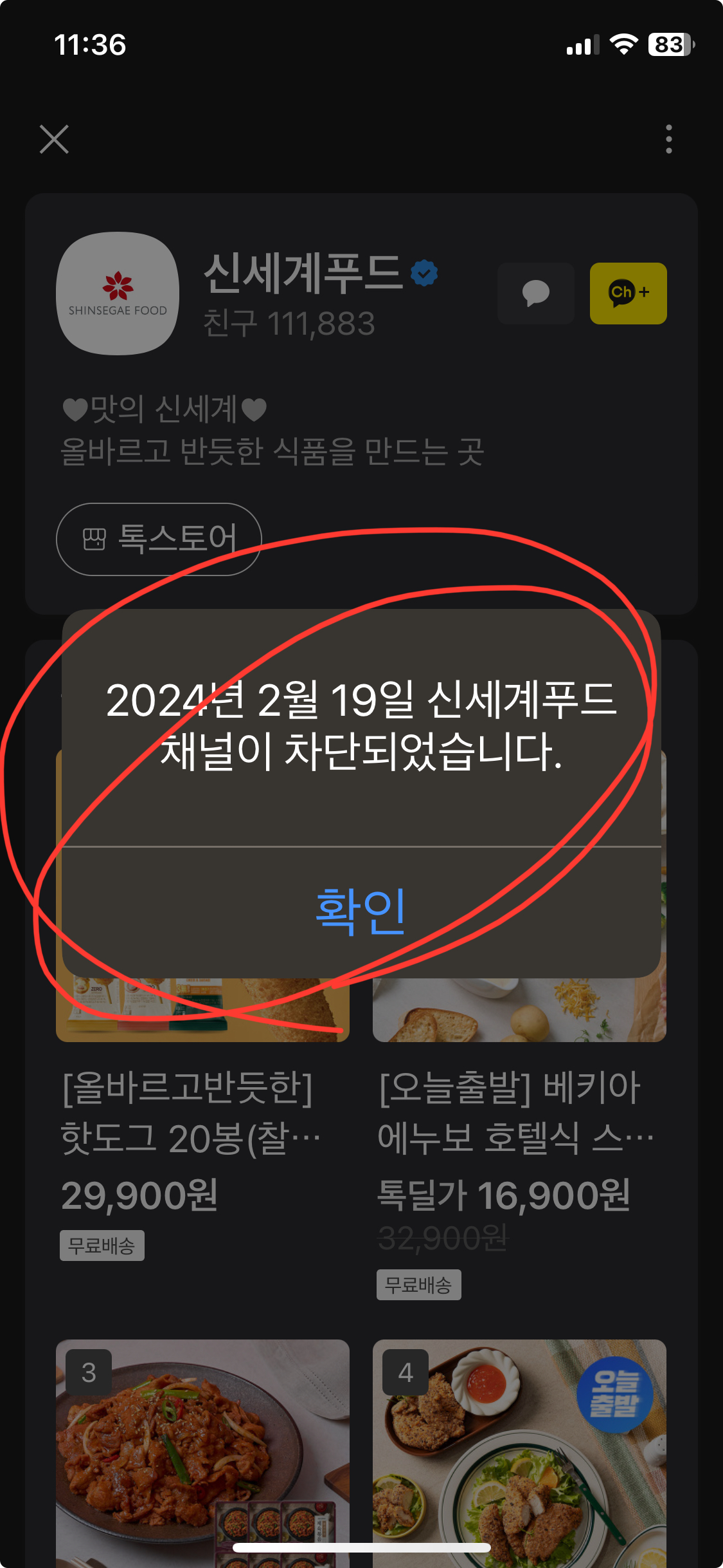 채널이 차단되었다는 확인 메시지가 팝업으로 뜨는 것을 볼 수 있습니다.
