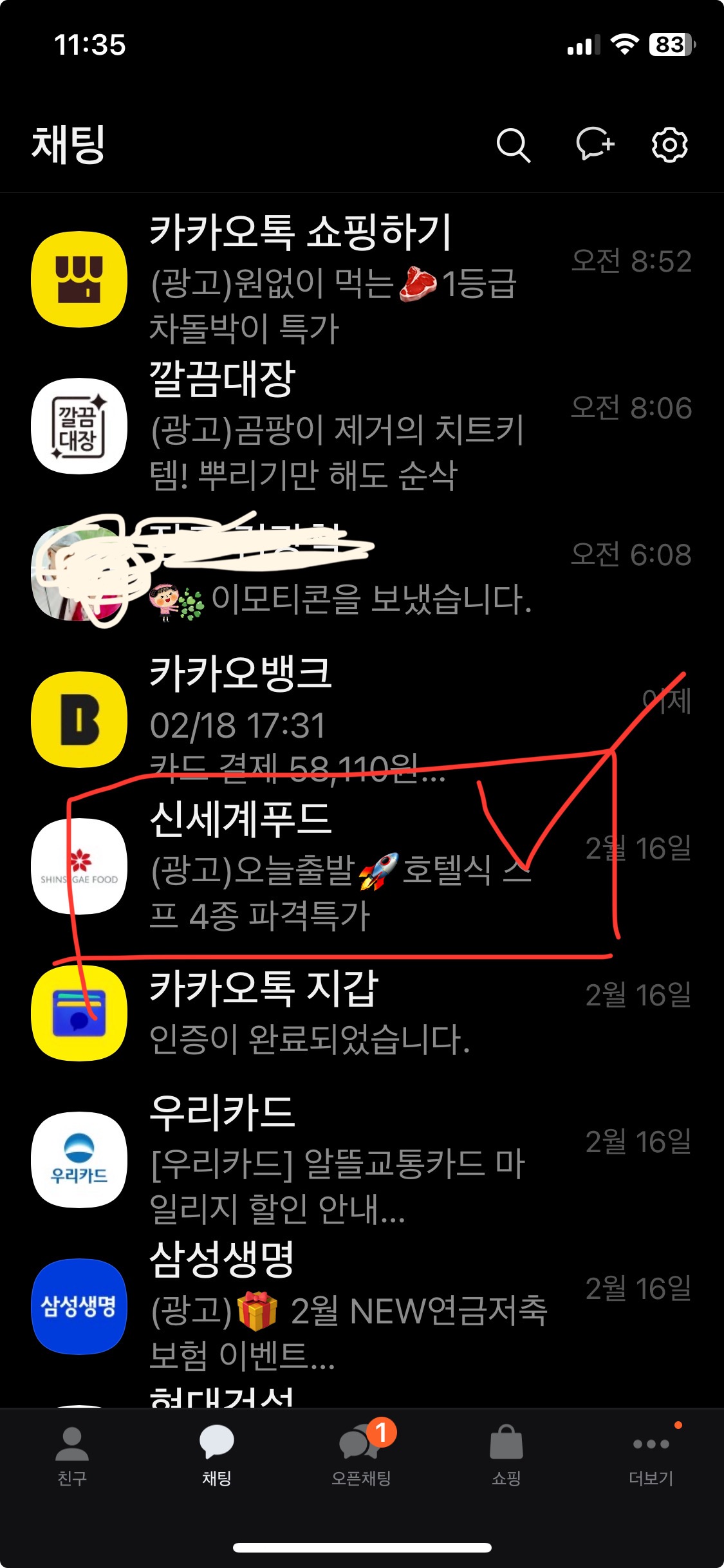 먼저 카카오톡 채팅 메인 화면에서 차단하기 원하는 채널을 선택합니다. 저의 메인 화면을 보니 구독 중인 채널이 너무 많아서 개인 과의 대화는 별로 없는 것이 보이네요.