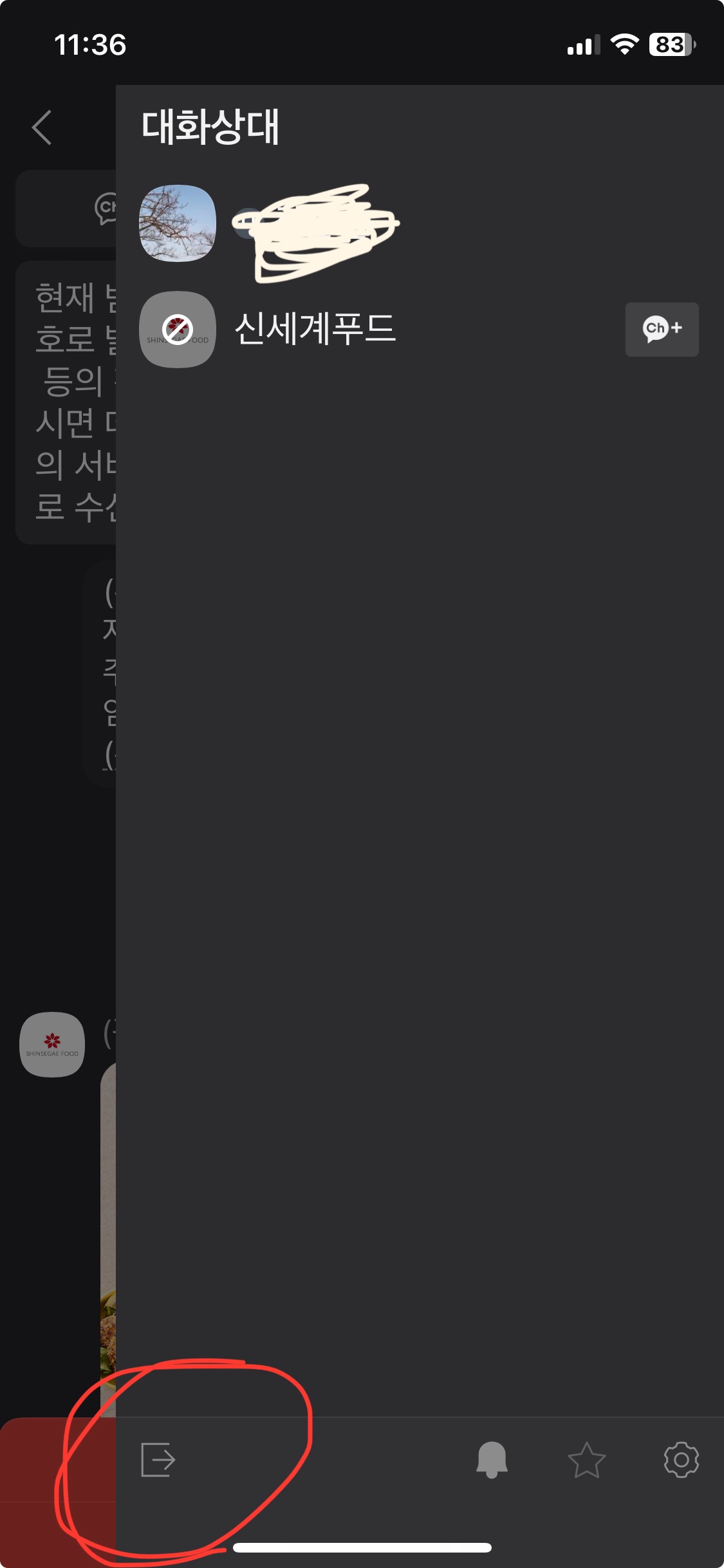 채널을 나가고 싶은 경우 대화상대 보이 제일 아래쪽 좌측에 있는 나가기 버튼을 클릭 또는 선택해 줍니다.