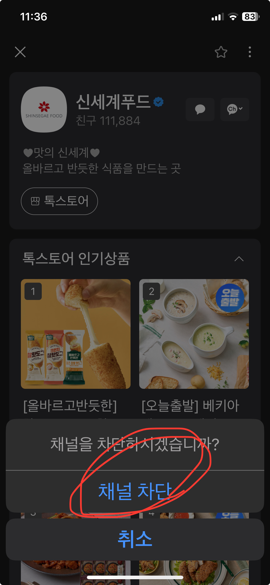 예시로 신세계푸드 채널을 차단해 보겠습니다.