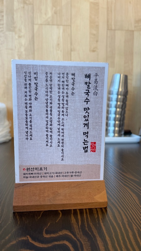 제가 방문한 곳은 평이담백뼈칼국수 분당정자점이었습니다. 회식 담당 선생님께서 이곳이 맛있을 것 같다며 추천해주셔서 함께 의논을 모아 다녀오기로 결정했습니다. 아래 사진은 테이블 위에 놓여 있는 메뉴판입니다. 뒷면에는 뼈칼국수 맛있게 먹는 법이 적혀 있습니다.