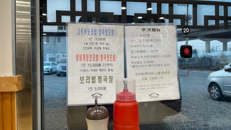 메뉴정보입니다. 보리밥청국장이 기본 메뉴인데 가격이 저렴합니다. 요즘 식당에서 만원 이하 음식을 보기가 드문데 기본 메뉴가 만원이 안됩니다. 식당 후기가 많은 이유 중 하나가 바로 가성비 때문이라는 생각이 들었습니다.