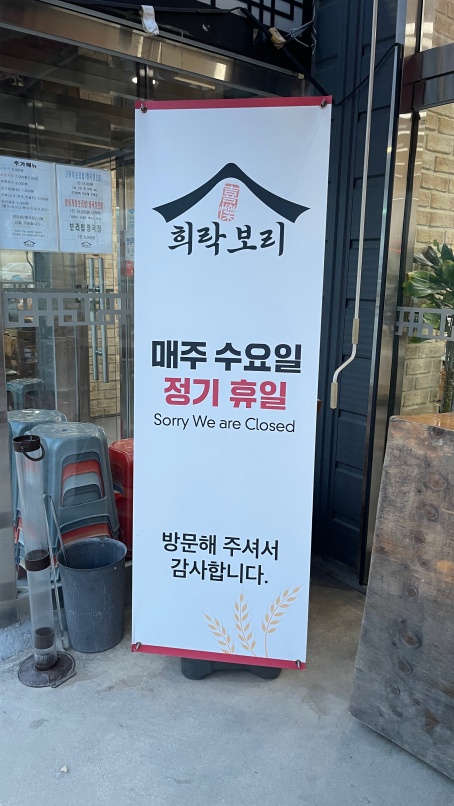 희락보리 쉬는 날은 매주 수요일입니다. 쉬는 날 식당에 방문하는 일은 없어야 하겠지요.