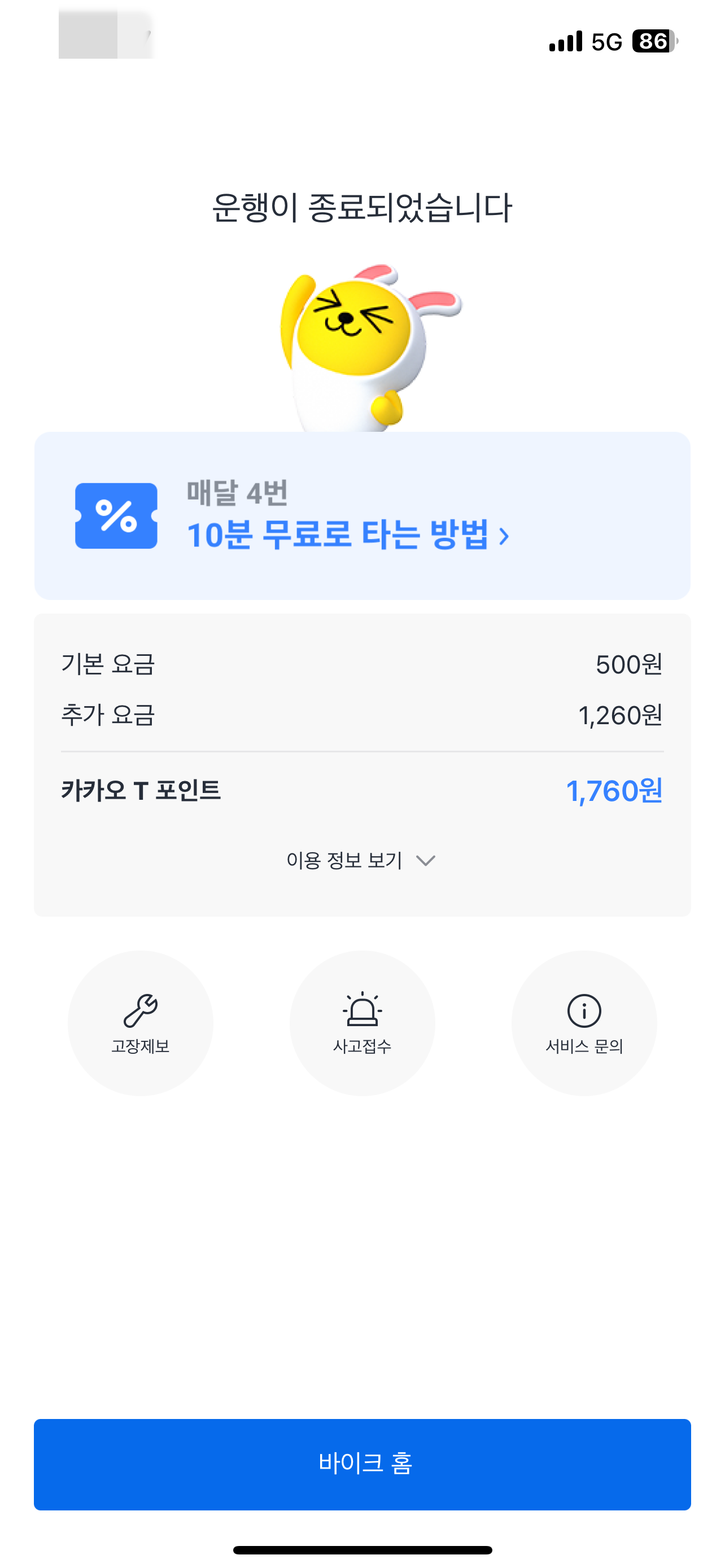카카오 바이크는 기본요금과 추가요금이 합산되어 최종 비용이 부과되는 구조입니다. 제가 운행한 지역은 용인시 기흥구 보정동이었습니다. 이 지역은 기본요금이 500원이네요. 여기에 10분 운행한 추가요금이 1,260원 더해졌습니다. 최종 결제금액은 1,760원입니다. 추가요금은 1분당 140원이었습니다.
