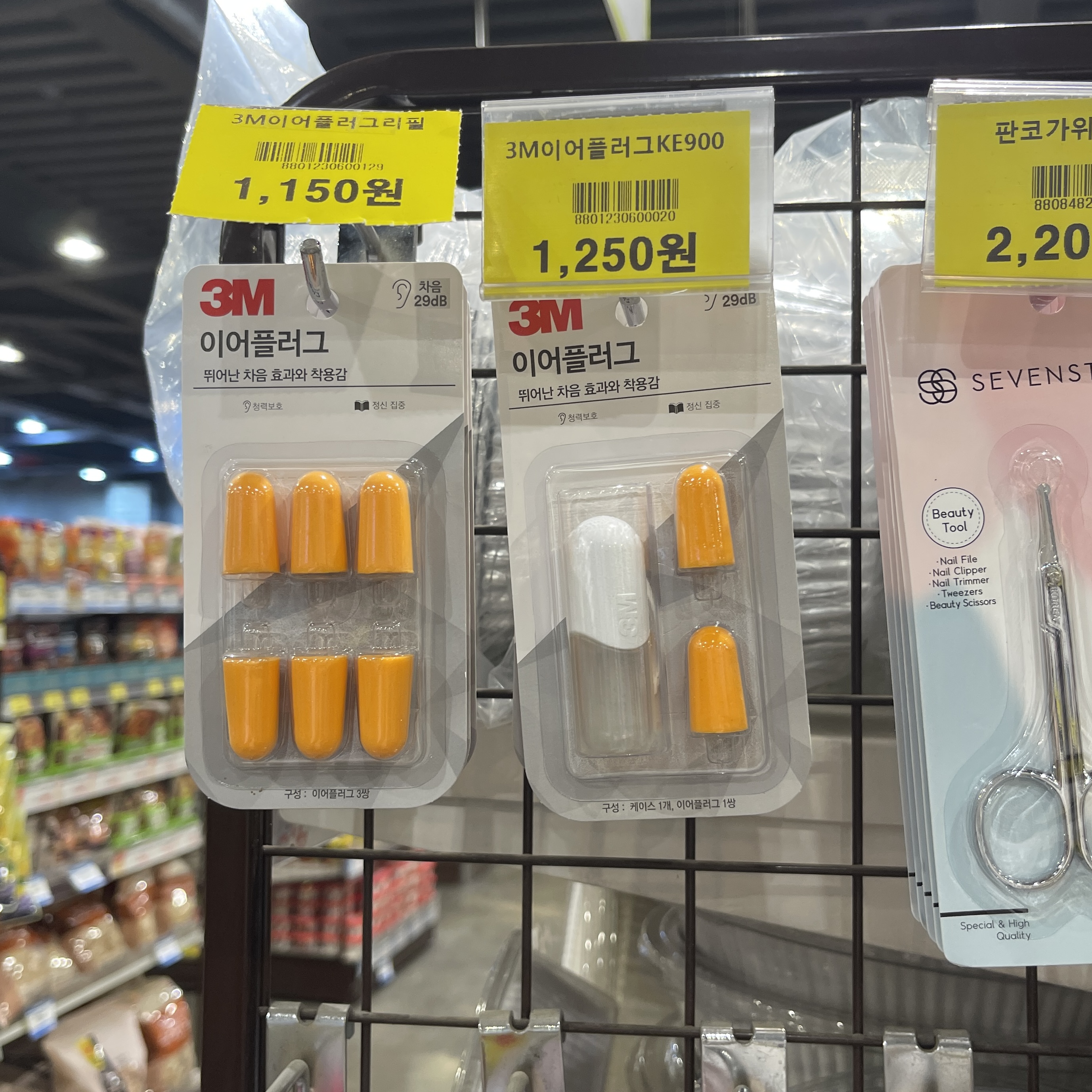 제가 구입한 오프라인 마트 구입가격은 3쌍 6개 가격은 1,150원, 이어 플러그를 보관할 수 있는 용기와 이어 플러그 1쌍으로 이루어진 제품은 1,250원입니다. 마트 가격이 편의점 가격보다 훨씬 저렴한 편입니다. 일반 편의점에서는 3배 정도 높은 가격에 판매되고 있는 것으로 알고 있습니다.