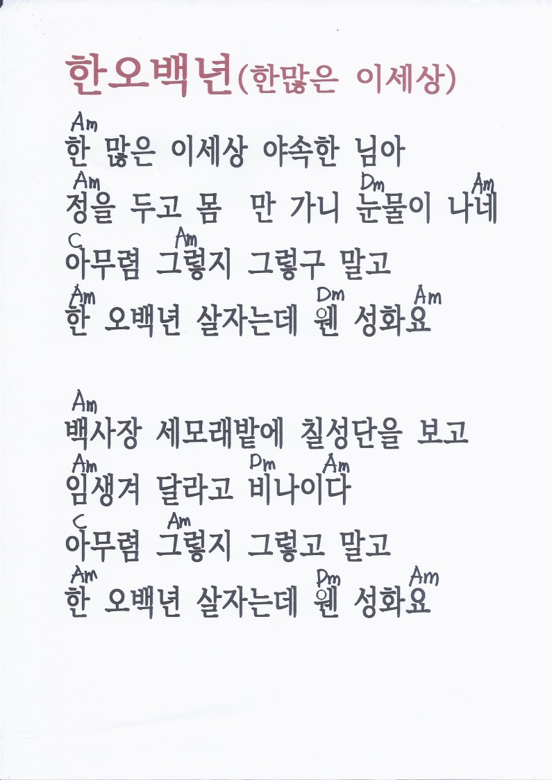 한오백년 노래 가사를 한글파일로 만들고 쉬운 기타 코드를 표시하였습니다. 한오백년 노래를 좋아하시는 어른들과 함께 가사를 보면서 기타 연주에 맞춰 노래를 부를 때 사용하시면 좋습니다. 저도 이 가사를 사용하는데 어른들이 편하다고 하십니다.