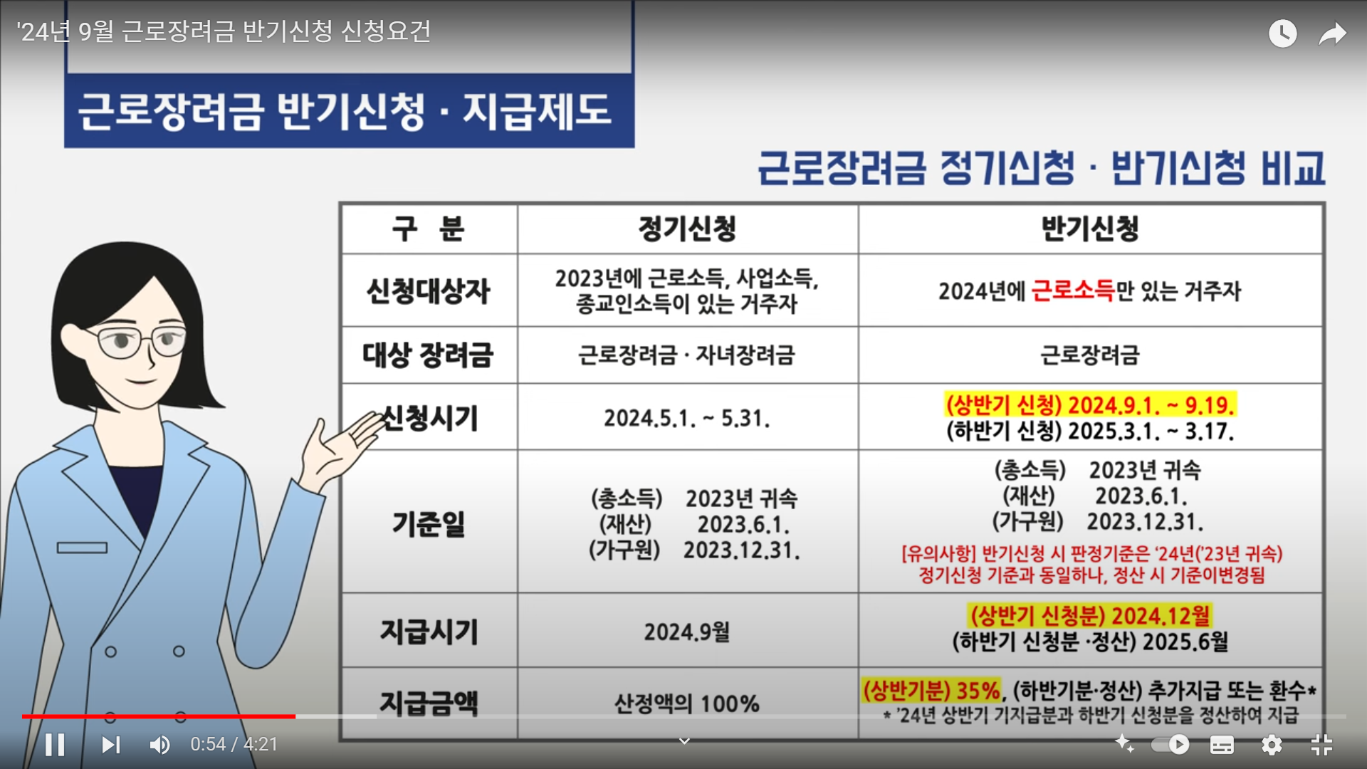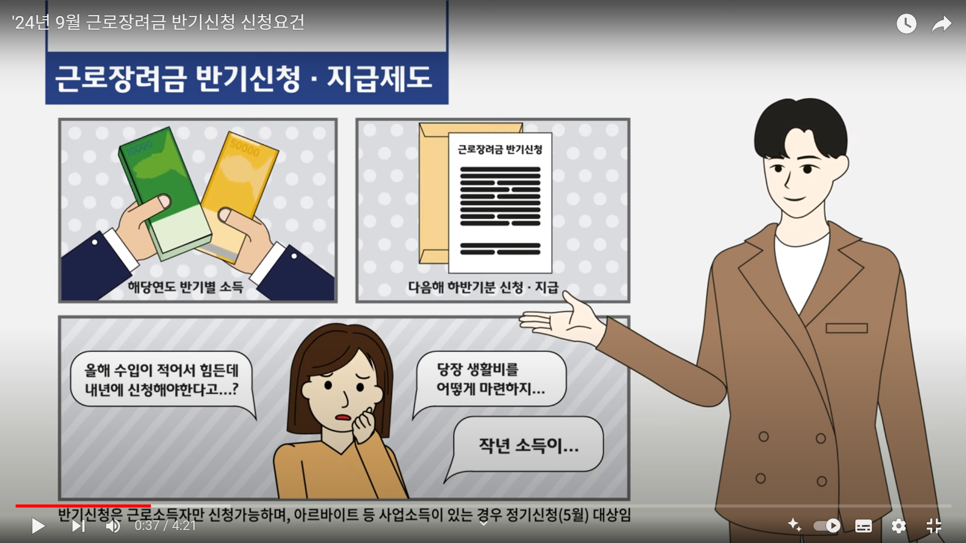 근로장려금 반기신청건에 대한 지급 일정은 2024년 12월 말에 지급될 예정입니다. 지급액은 산정액의 35프로이니 착오 없으시기 바랍니다. 더 자세한 사항은 아래 국세청에서 제작한 공식 영상을 통해서 확인해 보실 수 있으니 시간 되실 때 꼭 시청해 보시기 바랍니다.