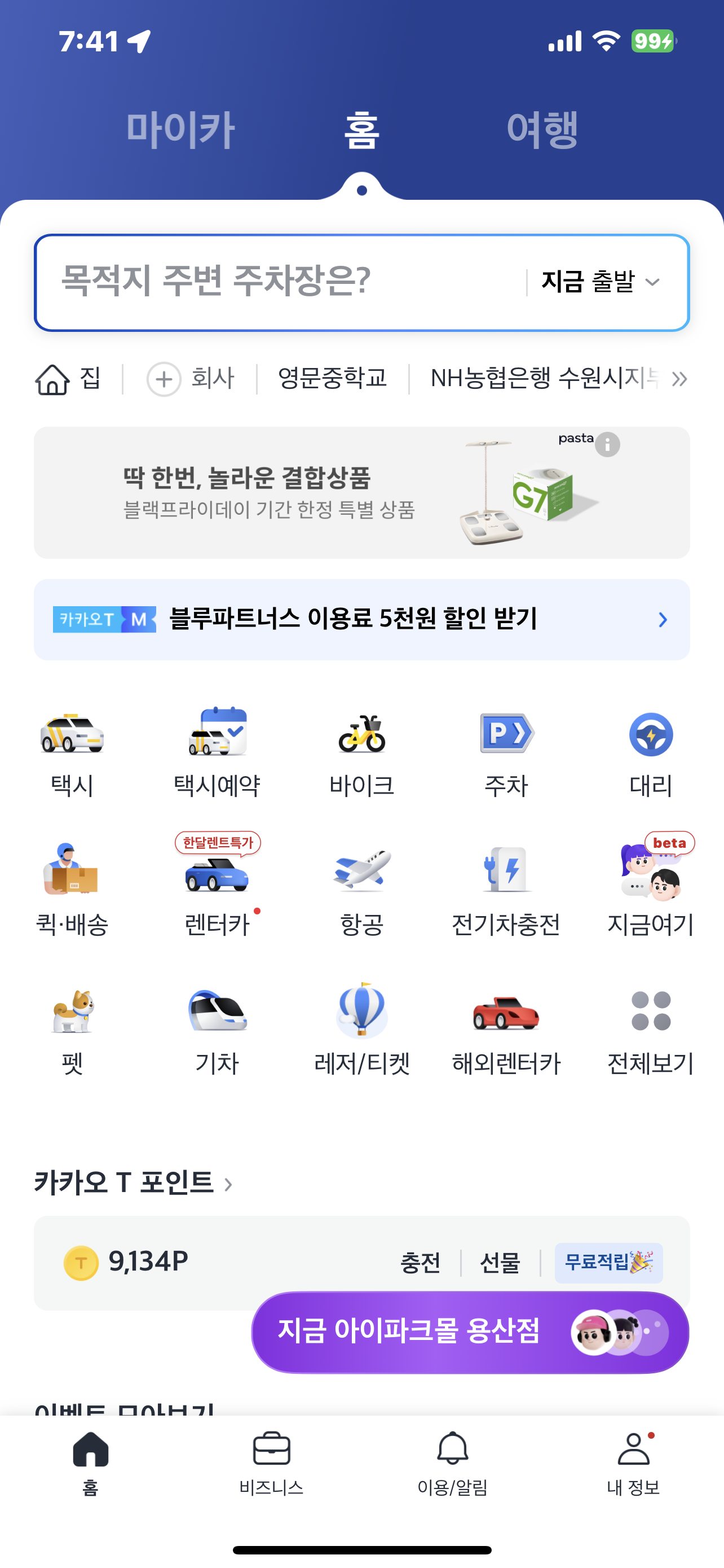 전기 자전거를 타야 할 것 같아서 주변을 둘러보았더니 노란색 카카오 바이크가 눈에 들어왔습니다. 카카오 T 앱에 들어가서 바이크를 누르고 운행을 시작했습니다. 운행을 마치고 난 후 요금을