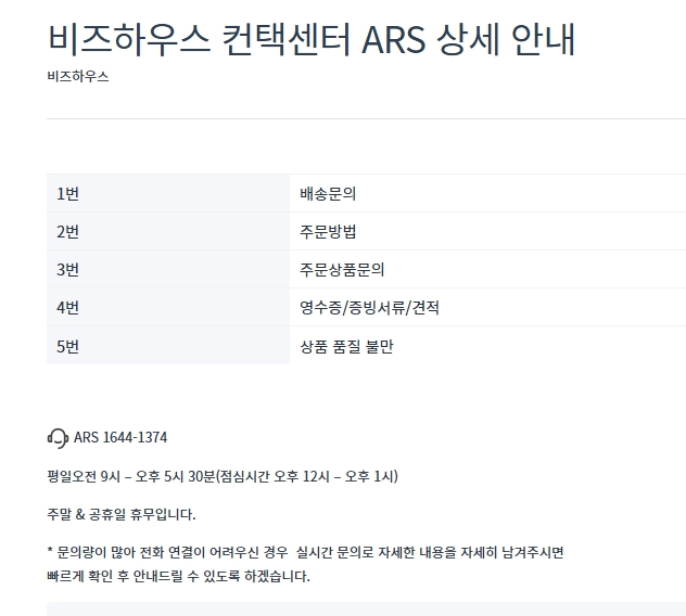 비즈하우스 고객센터 전화번호 상세안내를 보면 5번은 상품 품질 불만에 관한 문의 번호입니다. 5번을 누르고 다음 안내를 듣다 보면 상담원 연결은 0번을 누르라는 안내멘트가 흘러나옵니다. 이때 0번을 누르고 상담원과 통화하시면 순조롭게 원하시는 내용으로 상담을 받을 수 있습니다.