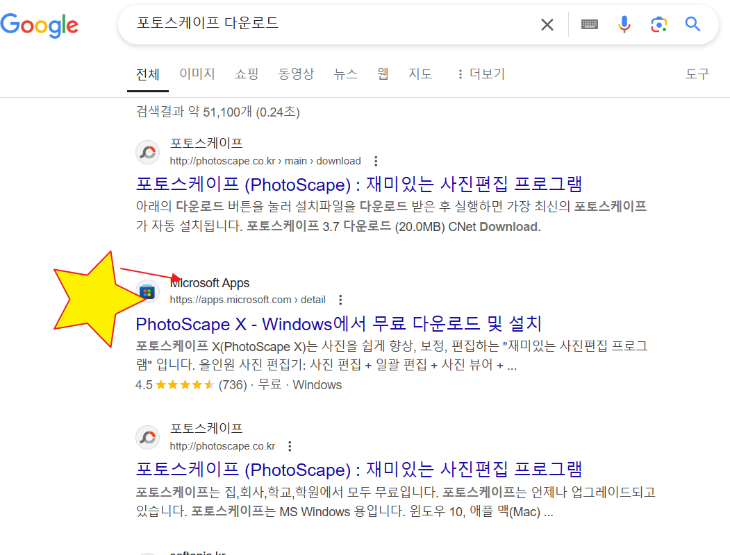포토스케이프 x를 윈도우가 깔려 있는 컴퓨터에 설치하는 가장 빠르고 정확하고 쉬운 방법은 마이크로소프트 스토어에서 다운 받는 것입니다. 구글 검색결과에서 2번째 나오는 사이트를 방문하면 됩니다. 아래에 링크를 남겨놓을테니 지금 바로 클릭해서 스토어를 방문해보시기 바랍니다.