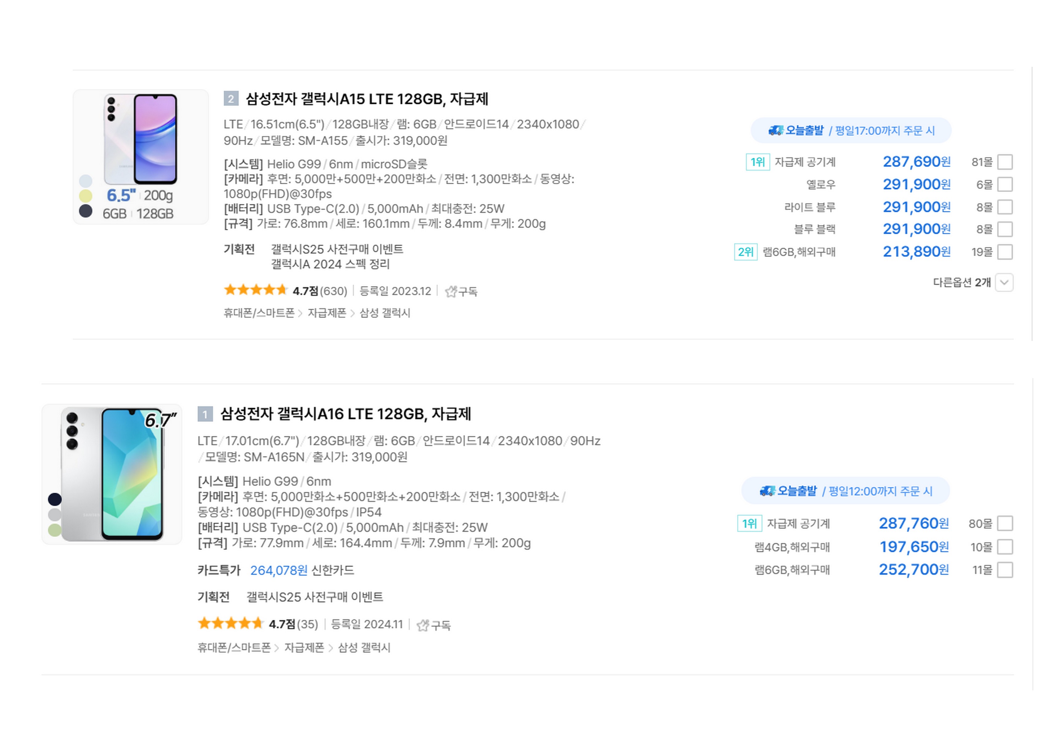 출시일은 A16이 최신모델입니다. 에누리로 검색해본 결과 A15는 2023년 12월에 출시된 반면 A16은 2024년 11월에 등록되어 최신 모델이라는 것을 알 수 있습니다. 출시일 측면에서는 A16이 더 좋은 선택이라는 생각을 하게 됩니다.