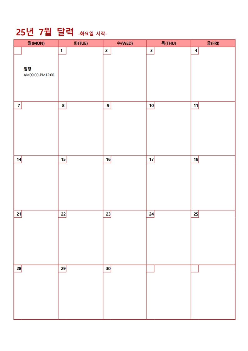 제가 만든 2025년 7월 달력은 평일 일정을 기록할 수 있도록 디자인하였습니다. 토요일과 일요일 칸은 만들지 않았습니다. 필요한 분들은 추가해서 사용하시면 됩니다.