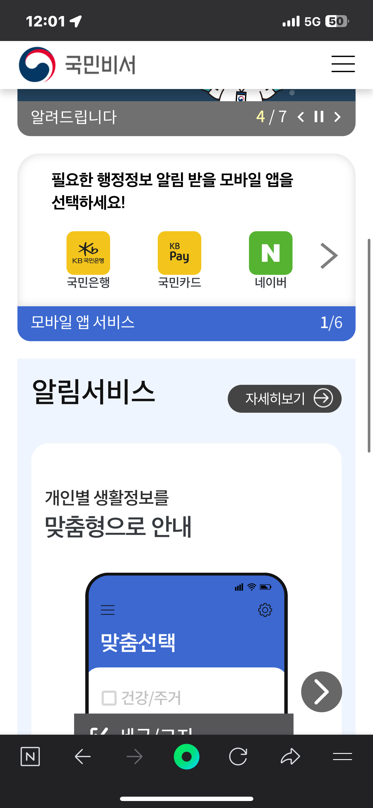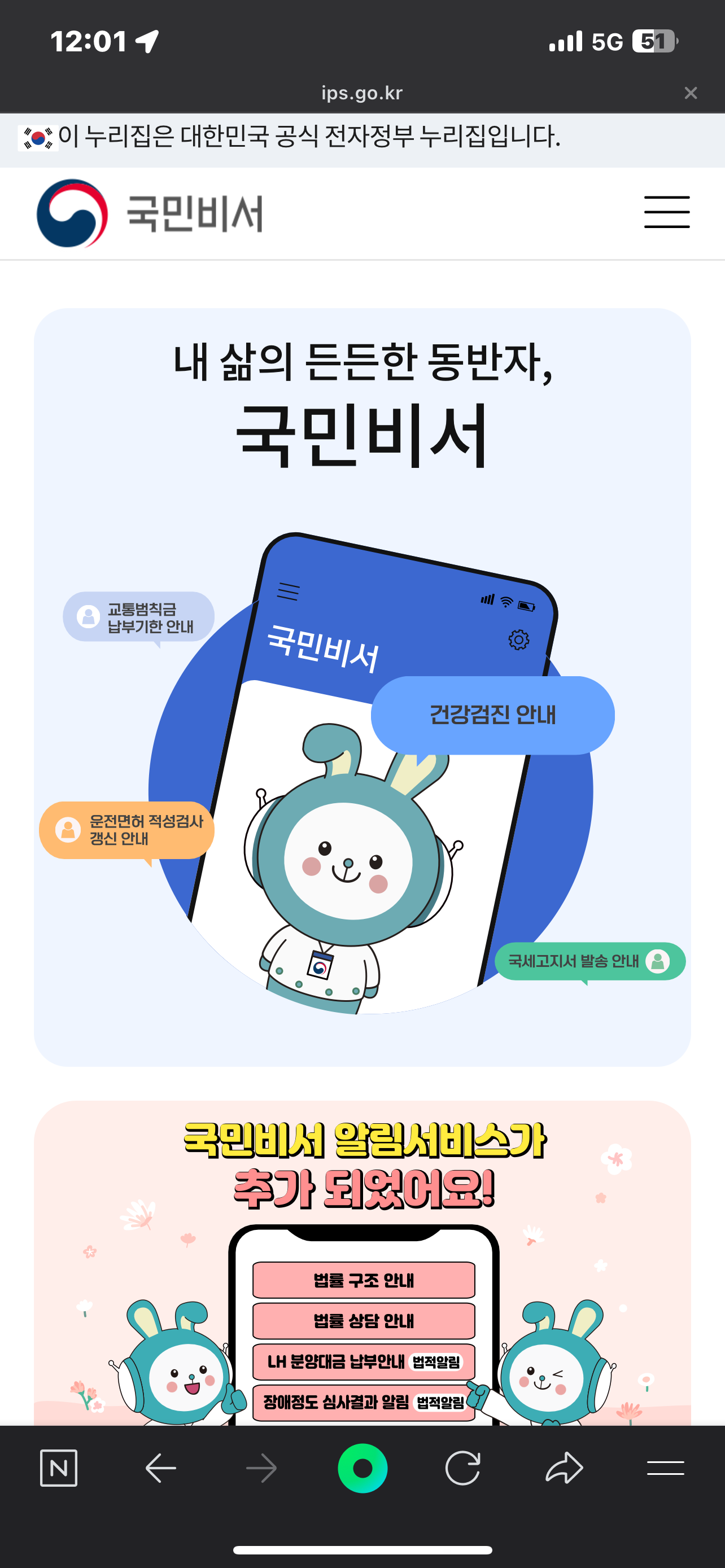 모바일 앱을 이용하시면 국민비서를 더욱 간편하게 신청할 수 있습니다. 네이버앱(전자문서 → 국민비서) 카카오톡(검색 → 국민비서 구삐) 토스(전체메뉴 → 국민비서)