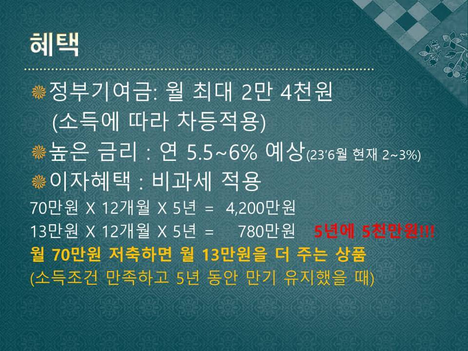 계산을 해봤더니 매월 70만 원을 저축하면 여기에 13만원을 더 준다고 생각하면 좋을 것 같습니다. 월 70만원을 저축했을 때 5년 경과되면 총 4,200만 원의 저축액이 형성됩니다. 여기에 800만 원을 더해서 5,000만원을 만들어준다는 목표를 세웠습니다. 800만원을 60개월로 나눠봤더니 월 13만 3천 원이 더해져야 합니다. 월 70만 원에 대한 수익률이 거의 20%가 되는 것이네요. 이처럼 역대급 혜택이 제공되기 때문에 계획대로 은행권들이 협조해 준다면 많은 청년들이 참여할 수 있을 것이라고 예상합니다.