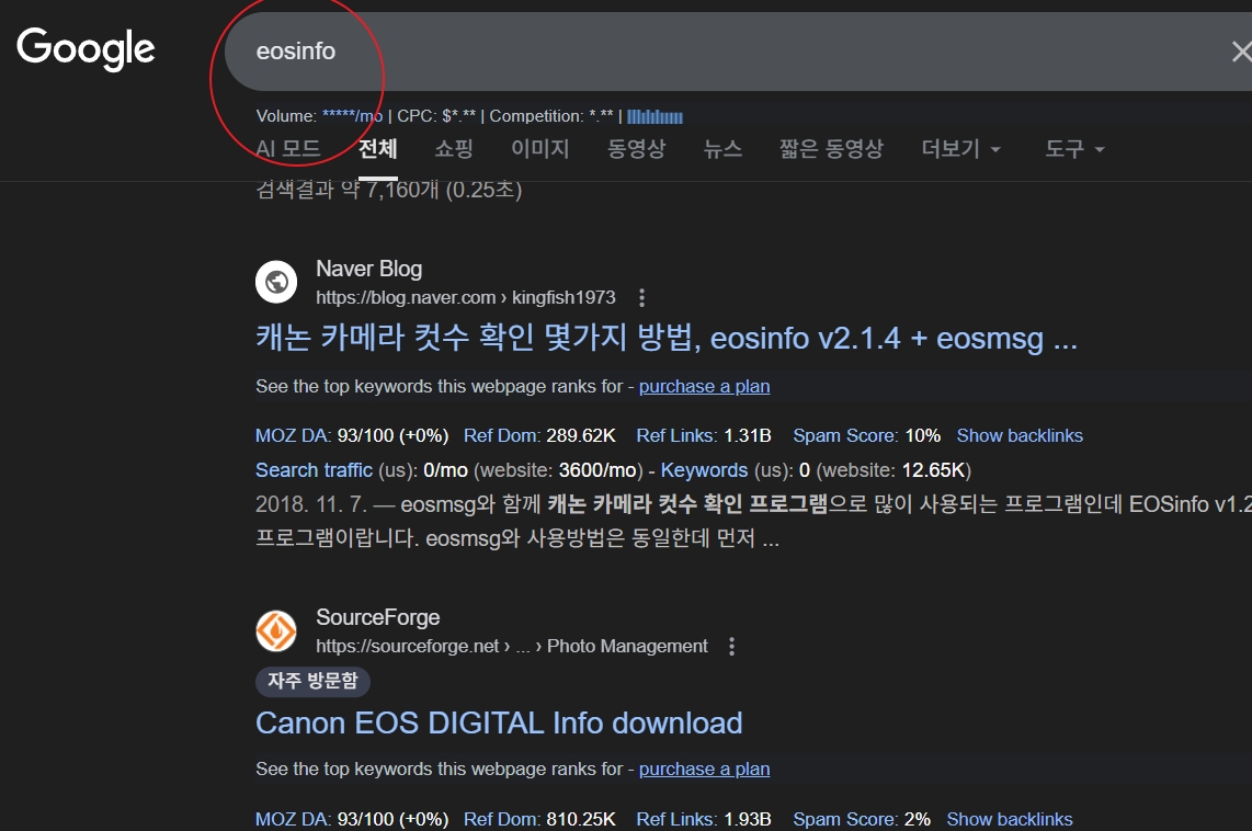 구글 검색창에 `eosinfo`라는 키워드로 검색을 합니다. 검색 결과 중 별점 후기가 있거나, 사용자들이 많이 다운로드한 신뢰할 수 있는 사이트를 선택하여 설치 파일을 다운로드했습니다.