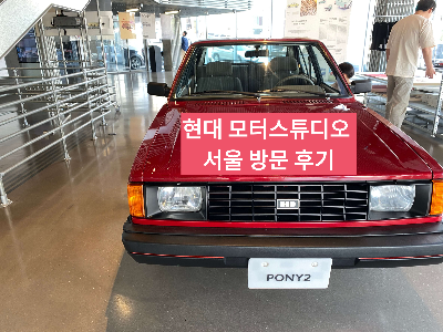 차를 맡기고 출입문으로 들어서면 4~5명의 안내데스크 직원들이 또 한 번 반갑게 맞아줍니다. 현대모터스튜디오 서울은 5층부터 관람할 수 있다는 안내를 해주시네요. 저는 먼저 1층을 둘러보았습니다. 1층에서는 현대 자동차 역사에서 빼놓을 수 없는 포니 승용차에 대한 스토리와 사진, 그리고 실제 자동차 전시물을 볼 수 있었습니다.